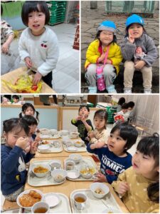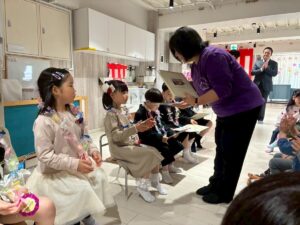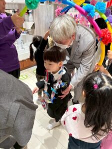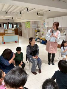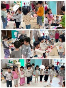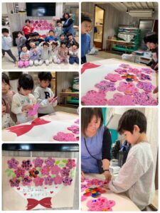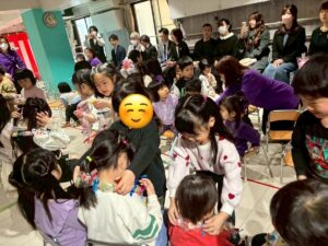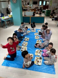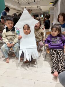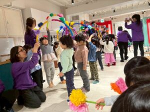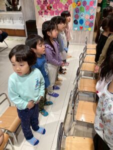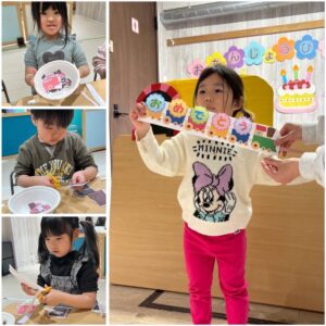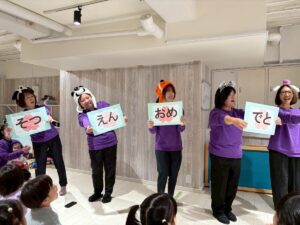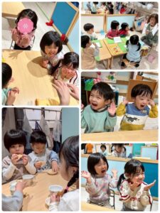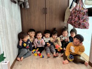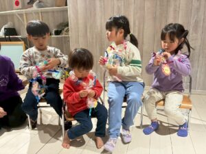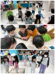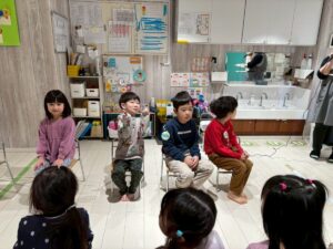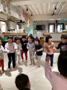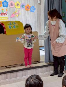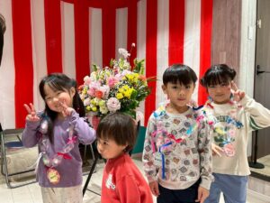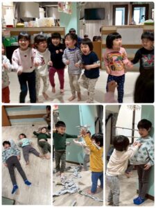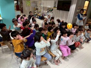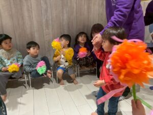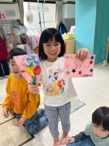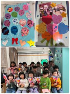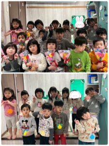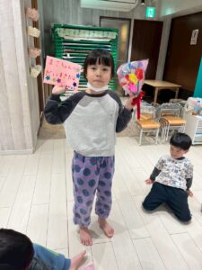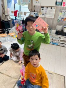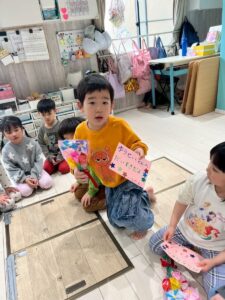3月は子供たちが卒園するクジラさんにありがとうがしたいというこで、こっそり企画し、ありがとうの会をしました。ゲームやプレゼントを渡しました。